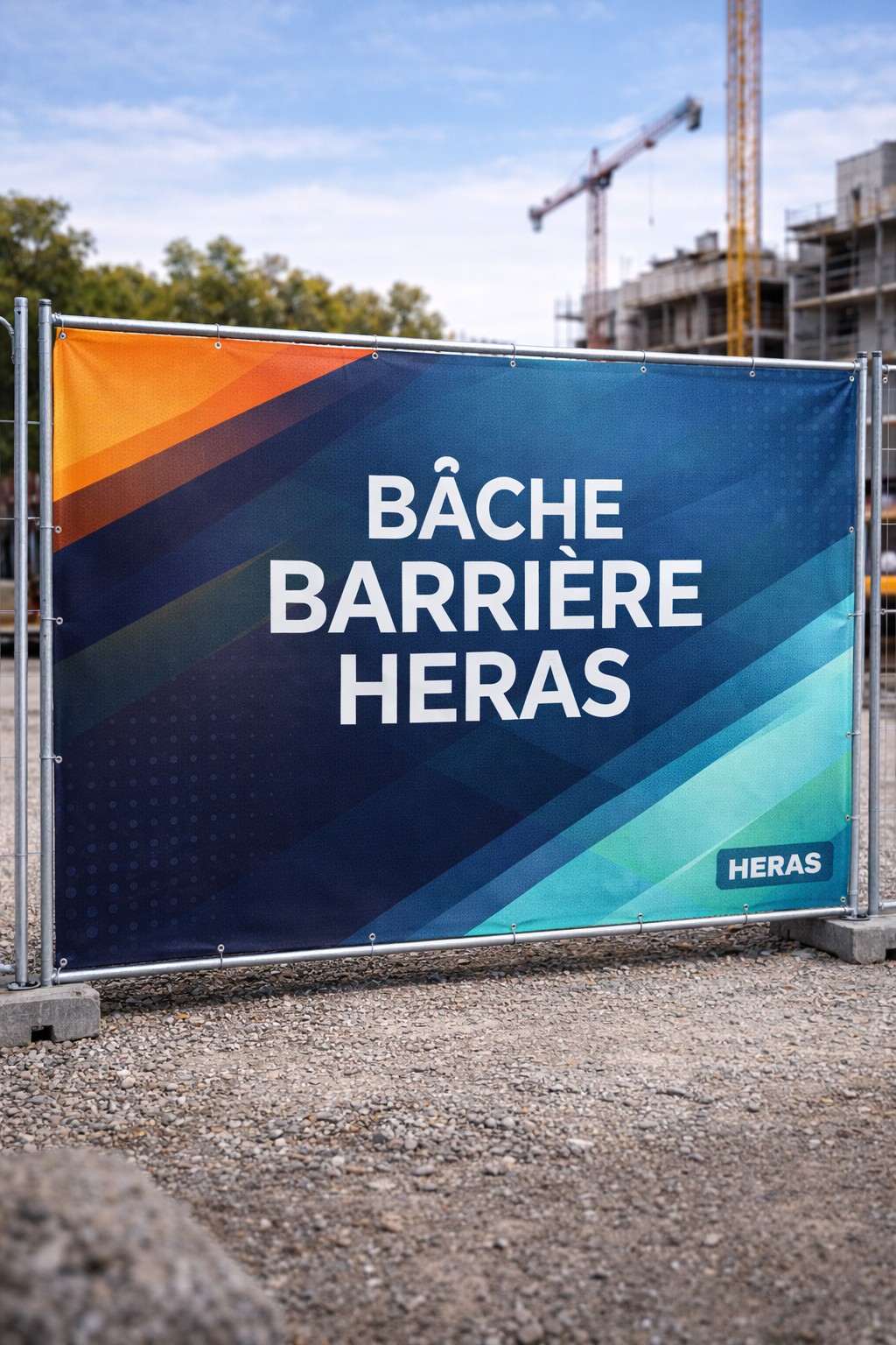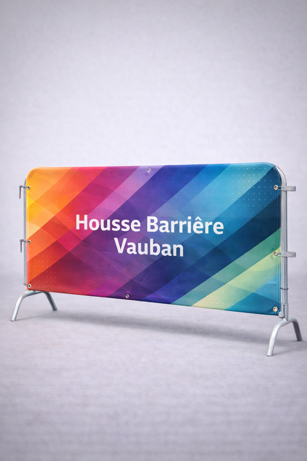 | Housse barrière Vauban / Héras | Habillage barrière événementielle | Impression 2 faces possible, haute tenue au vent | Festivals, événements publics |