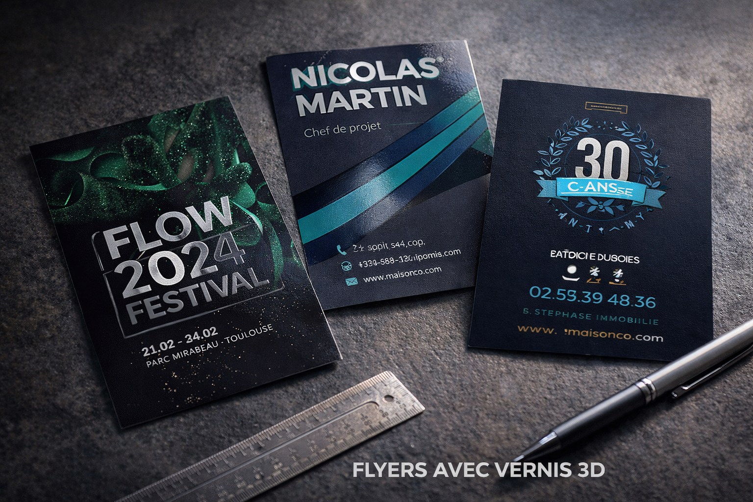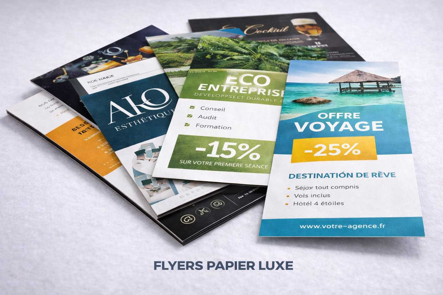 Nous recommandons les flyers papier luxe avec dorure ou vernis 3D pour un effet haut de gamme.