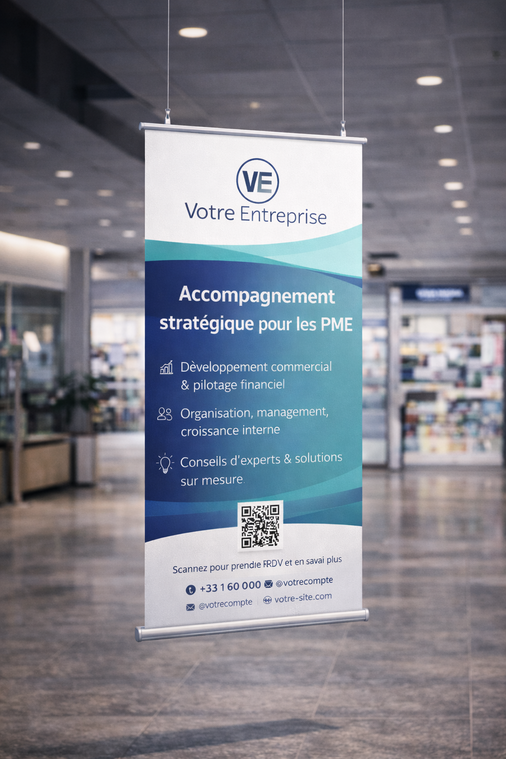 Idéalement dans une zone de passage fluide, à l’entrée d’un stand, d’un hall ou en vitrine. Assurez-vous qu’il reste bien visible sans gêner la circulation.